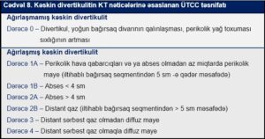 Ümumdünya Təcili Cərrahiyyə Cəmiyyətinin (ÜTCC) İşçi Qrupu tərəfindən 2015 – ci ildə kəskin soltərəfli kolon divertikulitinin KT müayinəsinin nəticələrinə əsaslanan, gündəlik təcrübədə həkimlərə rəhbərlik edə biləcək yeni, sadə təsnifat sistemi hazırlanıb nəşr edilmişdir. Bu təsnifata görə kəskin divertikulitlər iki yerə bölünür: ağırlaşmamış və ağırlaşmış. Ağırlaşmamış formaya iltihabi-infeksion prosesin yalnız kolonu əhatə etdiyi, peritona yayılmadığı, ağırlaşmış formaya isə bağırsaqdan kənara çıxaraq yayıldığı hallar aid edilir (cədvəl 8).